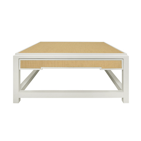 Locklin Matte White Lacquer and Natural Grasscloth Coffee Table with Two Hidden Drawers