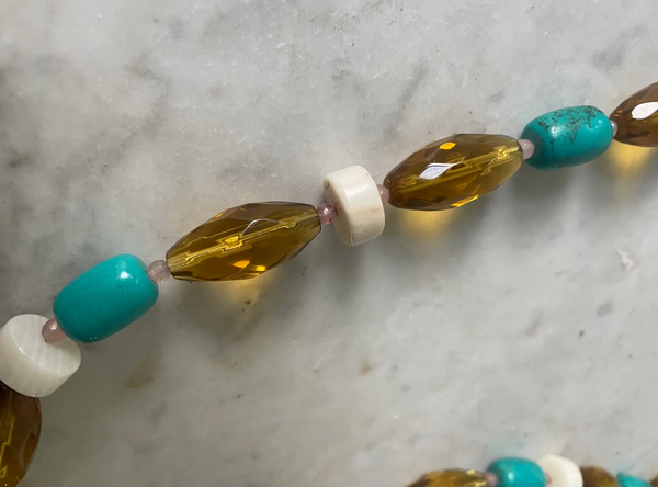32" Turquoise, White Branch Coral, and Amber Glass Beaded Necklace with Rose Quartz Spacers - Designed by Matthew Izzo