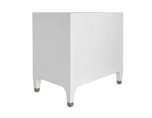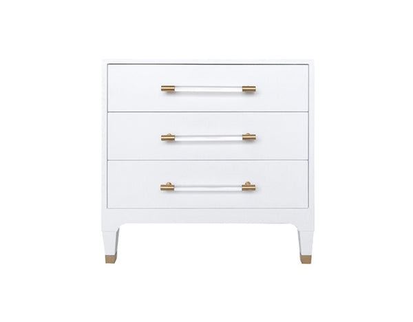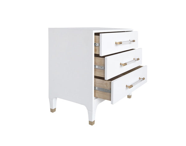 Amber White Linen Three Drawer Side Table with Acrylic & Brass Handles