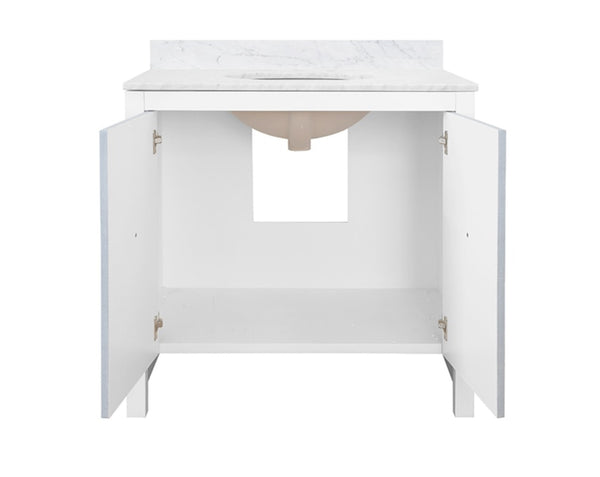 April Single Sink Bath Vanity - Light Blue Linen, Matte White Lacquer & Brass