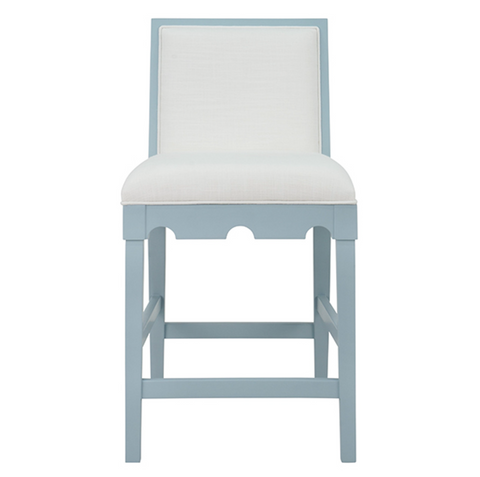 Lanister Light Blue Matte Lacquer Square Back Counter Stool with White Performance Linen Back & Seat