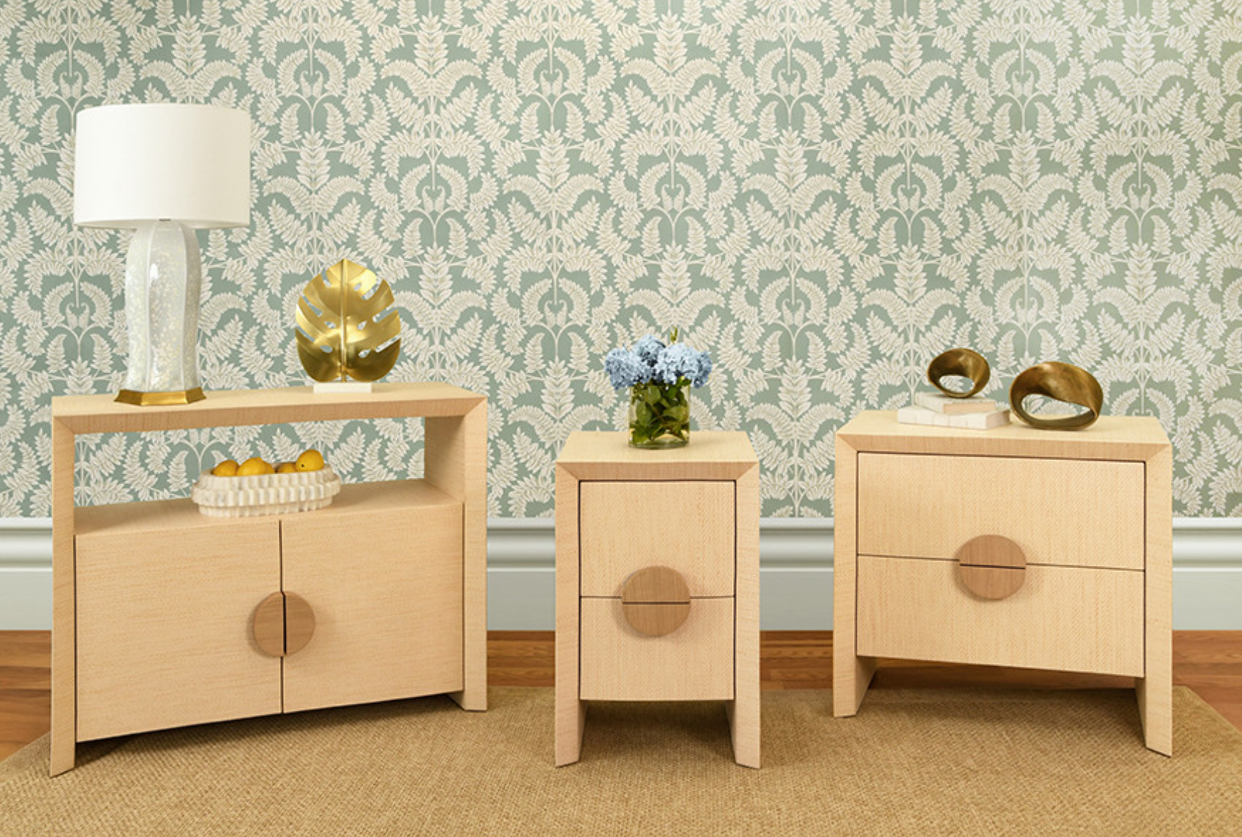 Aspen Two Door Console Table in Natural Grasscloth with Cerused Oak Handles