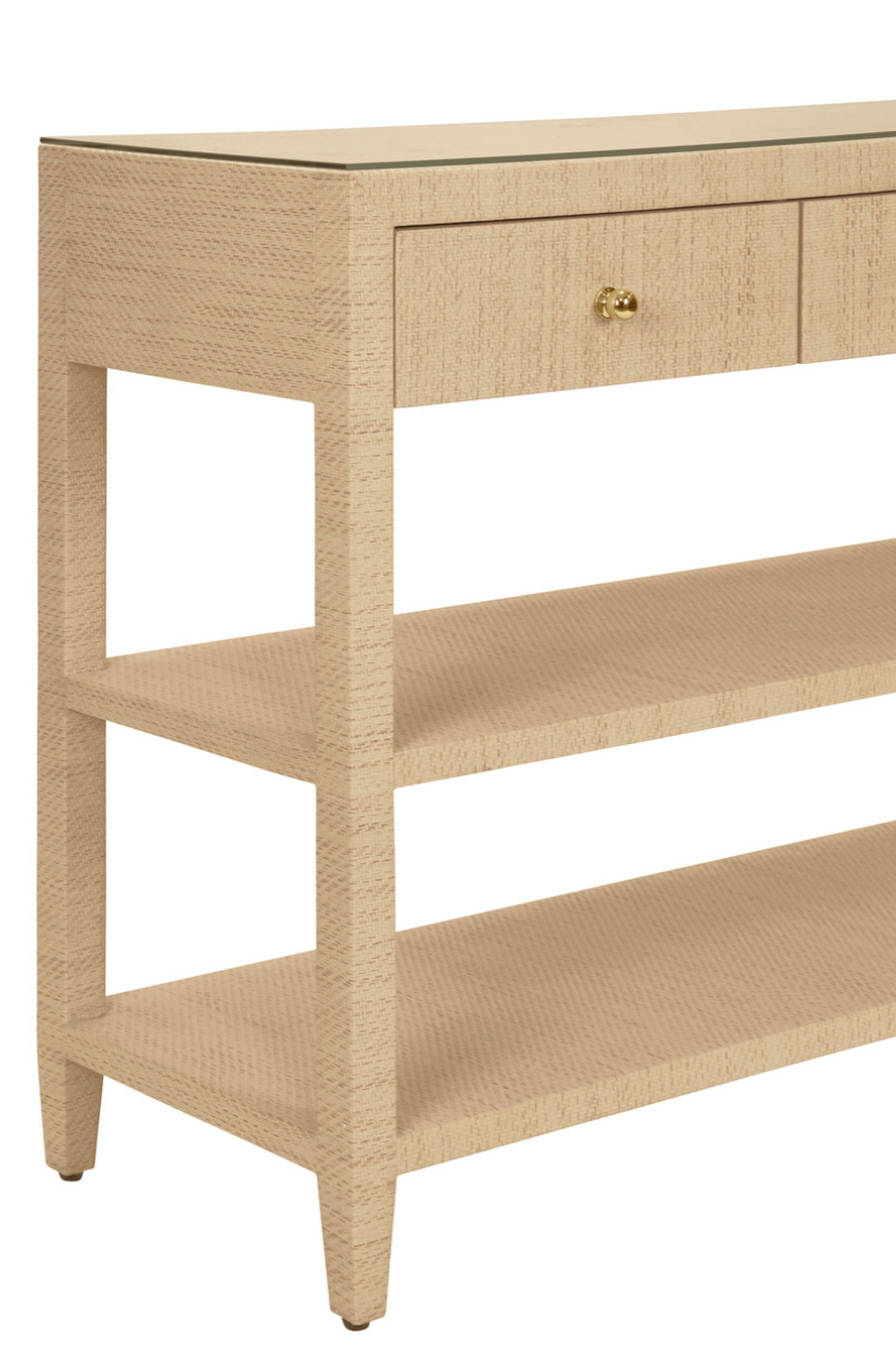 Meet the Briar Console—where storage meets style in the most charming way possible. This three-drawer beauty features natural grasscloth that brings organic warmth to any room, paired with polished brass knobs that catch the light just right. Two open shelves (9.75" and 10" between them) give you plenty of display space for your favorite finds, while the glass top adds a protective touch. Perfect for entryways, living rooms, or anywhere you need a little extra personality and function.
