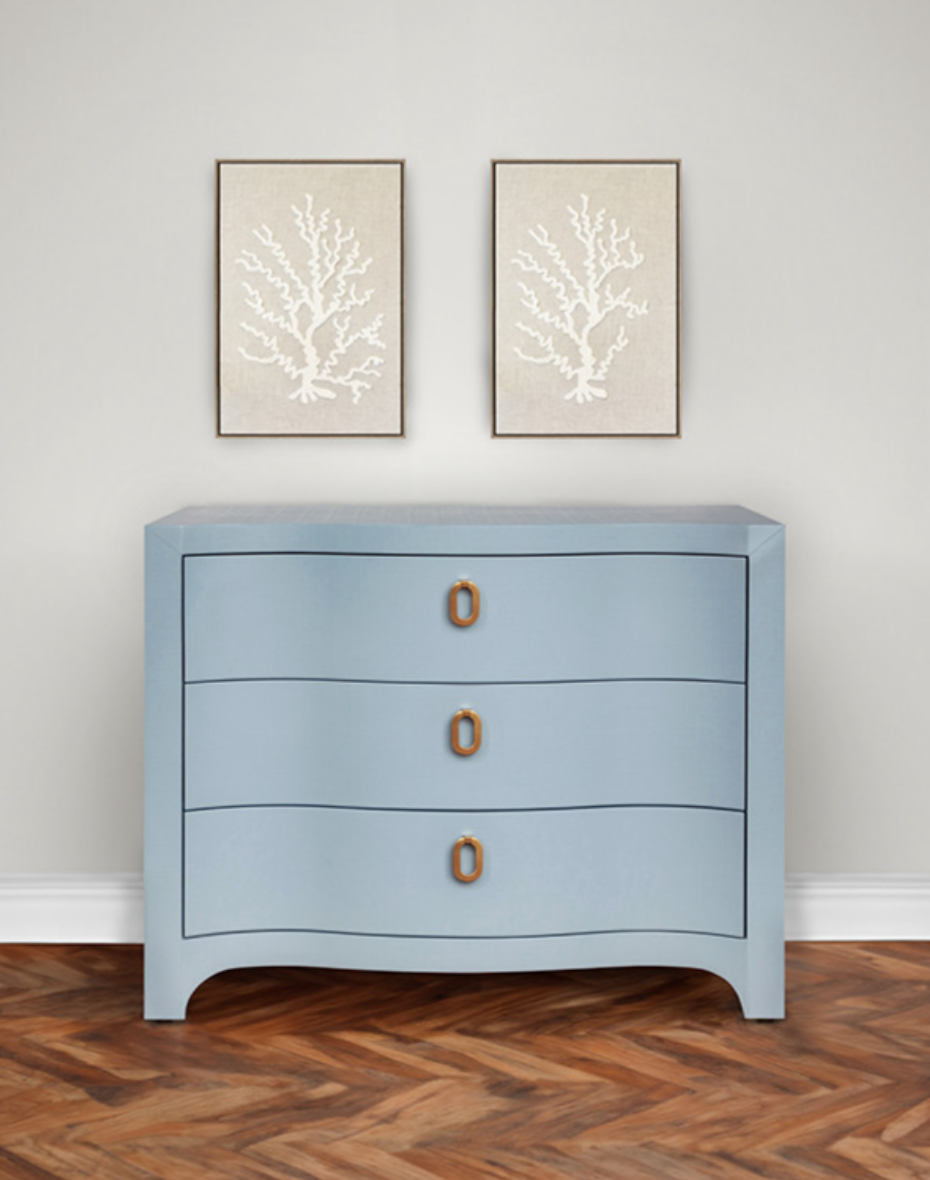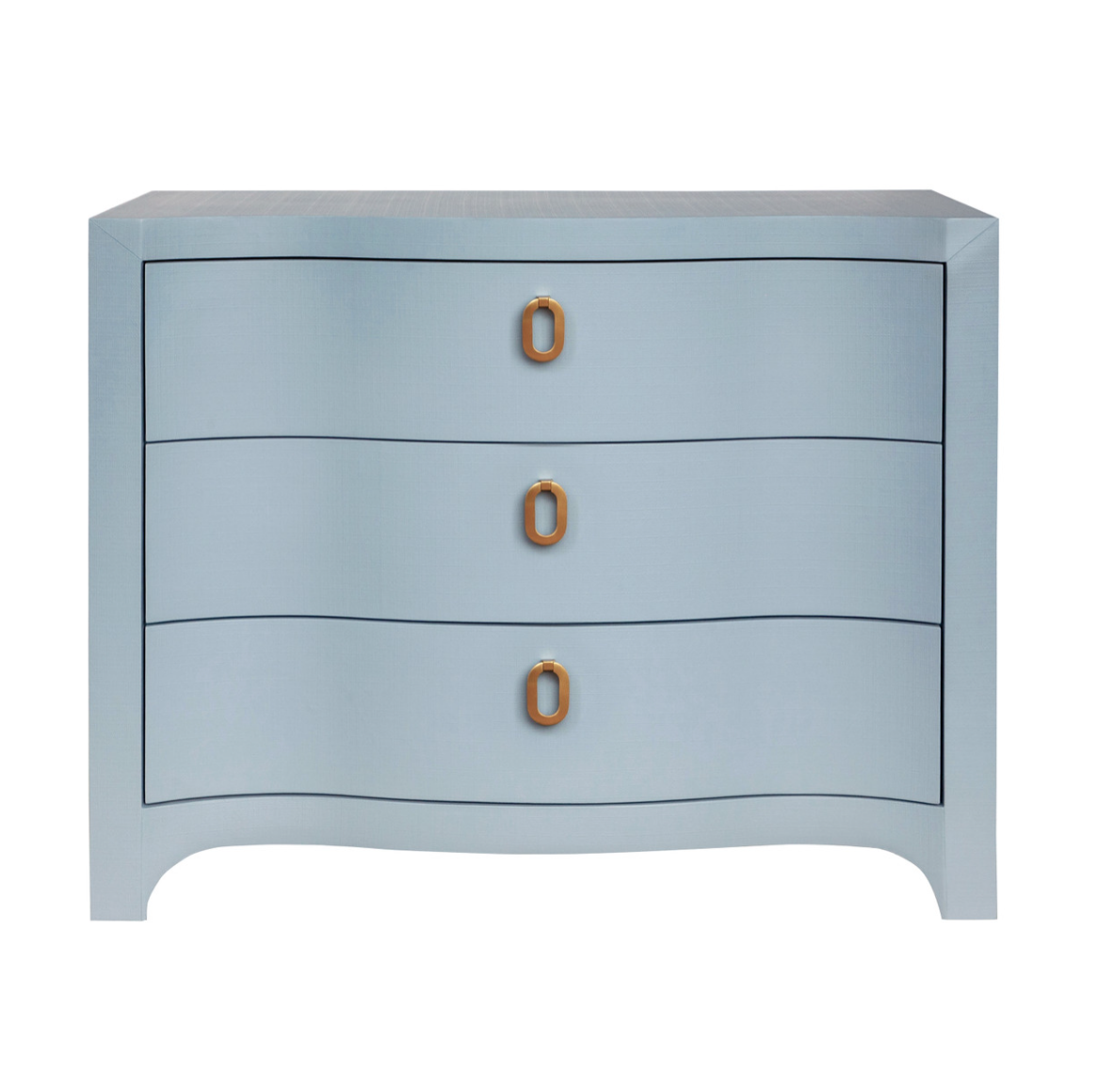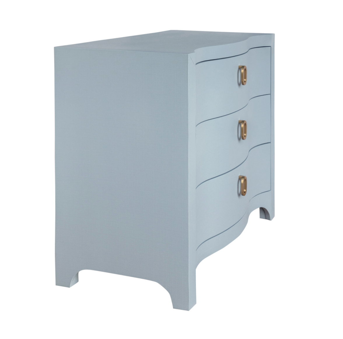 Cora Light Blue Textured Linen Three Drawer Chest with Satin Brass Drawer Pulls
