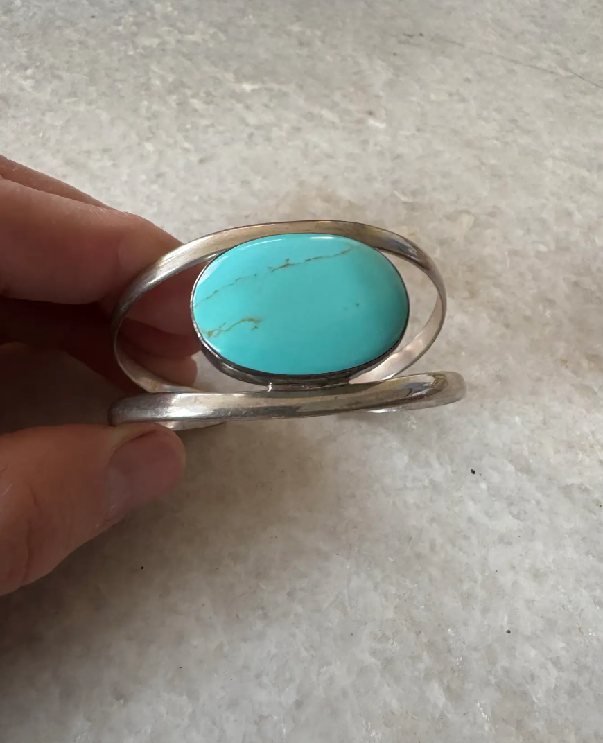 Wonderful vintage sterling silver turquoise cuff with large turquoise stone. Beautiful color and quality.